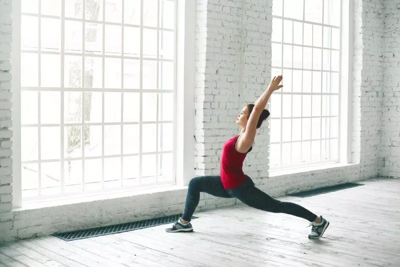 Из Собаки мордой вниз поставьте левую ногу между руками. Надавите на поднятую заднюю пятку и опустите таз к коврику, чтобы растянуть задний сгибатель бедра. Поднимите боковые части талии над бедрами. Поднесите руки к ушам и посмотрите вверх. Дышите. Поднимите взгляд вверх или продолжайте смотреть прямо перед собой.