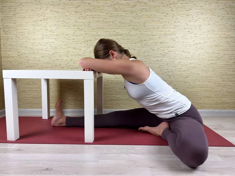 Сядьте перед стулом, вытянув под него правую ногу. Положите руки на опору. Опустите плечи вниз и сведите лопатки. Давите руками в стул, используя их как рычаг для вытяжения спины вверх. Не наклоняйтесь низко. Когда устанете, просто опуститесь грудью на опору и сконцентрируйтесь на дыхании. На каждом выдохе направляйте внимание в поясницу и таз, представляя, как выдох омывает позвоночник изнутри и смывает напряжение и боль. Находитесь в позе до 5 мин.