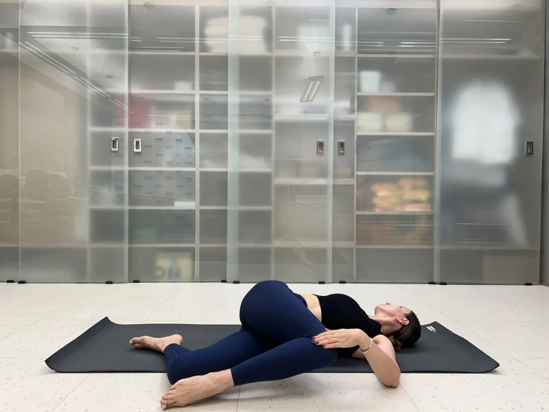 5. Джатхара Паривартанасана (версия позы скрученного живота). Лежа на спине, сгибаем колени и ставим стопы на пол. Правую стопу кладем на левое колено и на выдохе скручиваемся направо. В приоритете правое плечо – оно максимально близко к полу. Левую ладонь можно положить на правое колено. Взгляд по направлению правой руки. Следим за тем, чтобы поясница была плоской. Поэтому нижние ребра уводим чуть внутрь, живот внутрь, но дыхание не задерживаем. Фиксируемся на каждой стороне на 5 дыхательных циклов. Но только с этой асаной аккуратно, она не для всех спин будет полезна. Если вы выполняете ее в первый раз, то ладонью не помогаем и до конца колени не кладем на коврик.