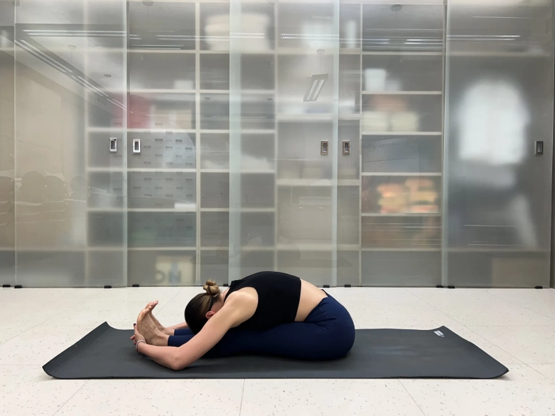 6. Пашчимоттанасана (поза вытяжения западной части тела, то есть задней части тела). Садимся на ягодицы и немного сгибаем колени. Начнем изначально с самой легкой версии. Положите живот на бедра, если не опускается, согните больше колени. Пальцы ног направлены вверх. И на выдохе максимально вытягиваемся вдоль ног. В приоритете соединение живота и бедер, особенно при «сложных» поясницах! Локти при возможности сгибаем и разводим в стороны и вниз. Заднюю поверхность шеи вытягиваем в одну линию с позвоночником. Усилие делаем на выдохе и, если позволяет задняя поверхность ног, колени вытягиваем. Удлиняем переднюю часть тела (живот и грудной отдел), и соединяем максимально с ногами. Минимум 10 дыхательных циклов.
