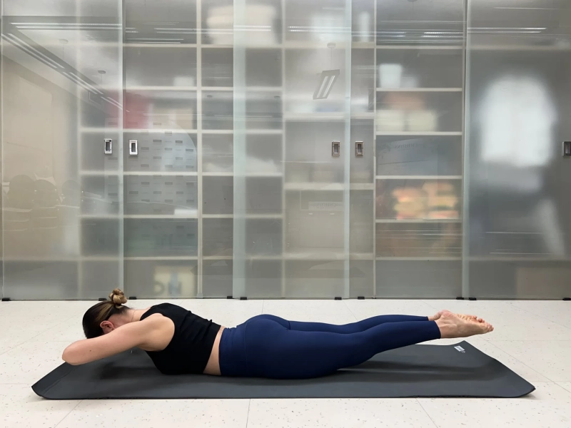 2. Шалабхасана (вариация позы Саранчи). Лягте на живот и обопритесь ладонями о пол. Приподнимая корпус, достаньте нижние ребра и удлините линию живота. Ноги вместе и колени прямые. Руки уведите вперед, положив ладонь на ладонь, а лоб положите на ладони. На вдохе поднимите ноги, руки и грудной отдел вверх. Лопатки уводим друг к другу и опускаем вниз. Удлиняем шею, а подбородок уводим к ключицам избегая хоть малейшего залома в шее. Фиксируем минимум на 5 дыхательных цикла.