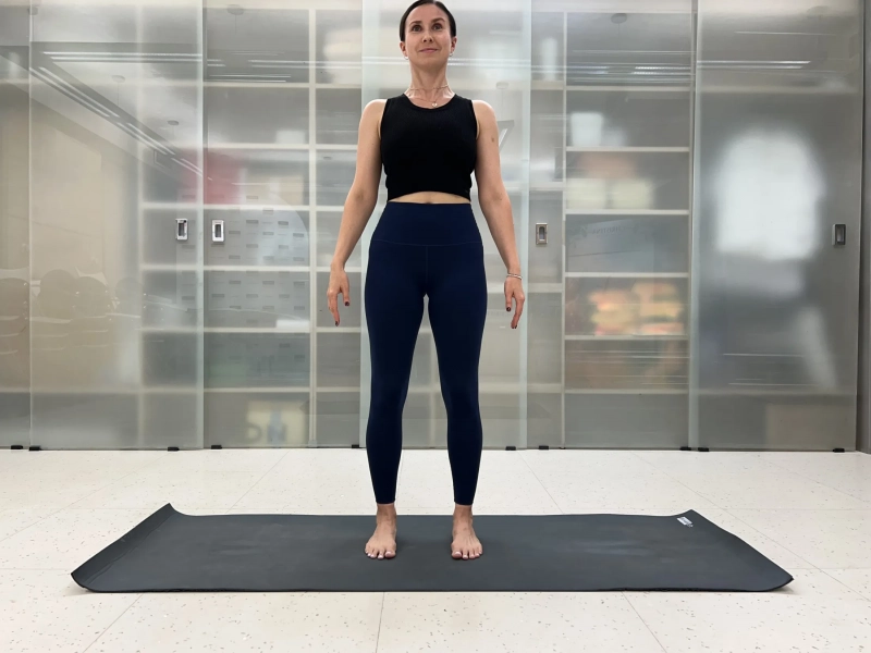 1. Тадасана (поза Горы, модификация). Встаньте прямо, ноги на ширине таза, стопы параллельны друг другу. Подкрутите таз, чуть напрягая ягодичные мышцы, стремясь поясницу сделать более плоской. Нижние ребра направьте внутрь и вниз. Плечи оттяните к тазу. Руки расслаблены. Распределите вес тела по всей плоскости стопы. И как только отстроили асану, начните раздвигать стопами пол в разные стороны друг от друга, как будто разрывая ногами коврик. Сосчитайте около 5 дыхательных циклов, расслабьтесь. Возможен повтор еще 2-3 раза.