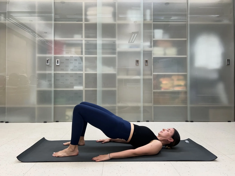 4. Сету Бандха Сарвангасана (поза Полумоста, динамическая версия). Ложимся на спину. Колени согнуты, стопы на ширине таза и параллельны друг другу. Руки вдоль тела ладонями вниз. Напрягите ягодичные мышцы так, чтобы вы почувствовали, как ваша поясница становится более плоской. Аккуратно поднимаем таз, медленно позвонок за позвонком – до середины спины в легком варианте и до лопаток в более усложненном. И так же, позвонок за позвонком, аккуратно опускаем таз на коврик, прокатывая строго поочередно каждый позвонок. Больше растягивая спину, чем накачивая ягодицы. Задача: прочувствовать поясничную линию позвоночника и научиться, напрягая мышцы живота, опускать таз, строго прокатывая спину. Повторяем от 8-12 раз.