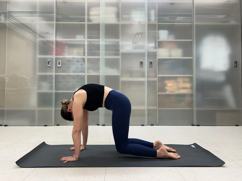 3. Марджариасана (силовая версия позы Кошки). Исходное положение как в позе Стола: запястья под плечами и на ширине плеч, а колени под тазобедренными суставами на ширине таза. Округлите спину и взгляд направьте в сторону живота. Стопы лежат на полу на внешней стороной. Ладони полностью раскрыты и плотно прижаты к полу. В этом положении поднимите колени над полом примерно на 7-10 см или на высоту пяток. Напрягите ягодичные мышцы. Удерживаем позу минимум 8 дыхательных циклов.