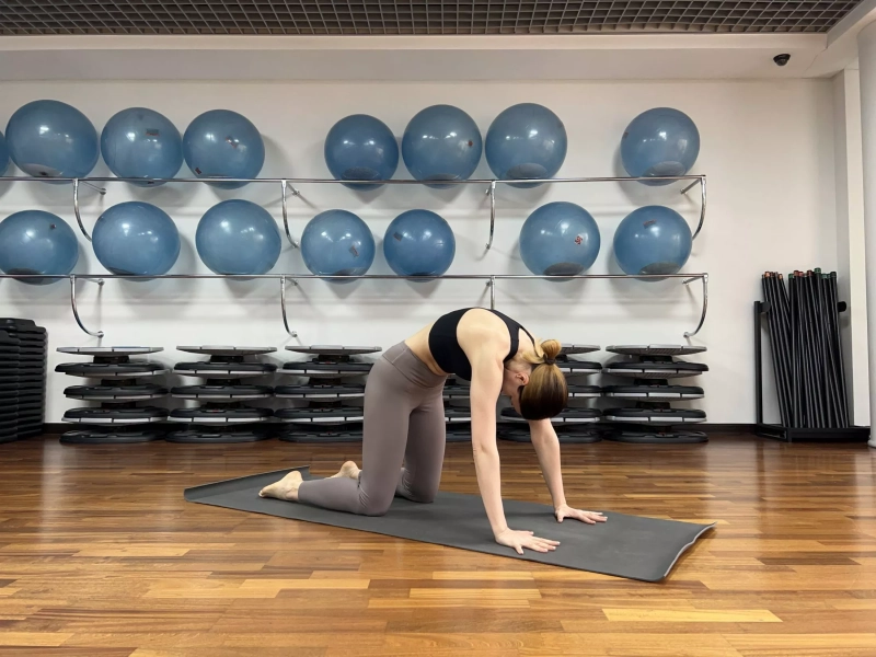 5. Марджариасана (поза Кошки): ноги на ширине таза, руки на ширине плеч. Опора на колени и ладони. На вдох, волной от копчика до макушки делаем прогиб. На выдох округляем спину так же, позвонок за позвонком, лопатки максимально разводим в разные стороны. Локти оставляем прямыми. В случае с сильными болевыми ощущениями в пояснице, лучше задержаться с округленной спиной, подкручивая максимально таз, представляя, что мы носом хотим дотянуться до лобковой кости. Выполняем в среднем 10 циклов. Для большего эффекта в случае компенсации грудного отдела, представьте, что ладонями разрываете коврик в разные стороны: левой рукой налево, правой рукой направо. И все это с округленной спиной.