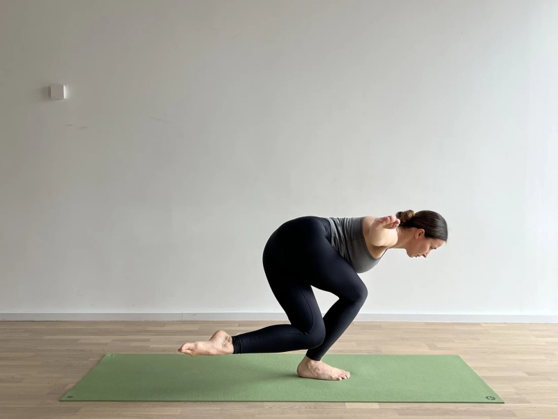 1.Вирабхадрасана 3 (поза Воина 3 с динамичной модификацией). Поставьте ноги вместе и уведите руки в разные стороны на одну линию с плечами. Одновременно поднимайте правую ногу вверх и назад, а корпус наклоняйте вниз и вперёд. Постарайтесь увести корпус с правой ногой на параллельную линию относительно пола. Макушка направлена вперед. Таз закрыт. Нижние ребра уводим внутрь. Плечи отведите от мочек ушей. Колени прямые. Пальцы правой ноги смотрят в пол. Взгляд направьте вниз, как вариант — на большой палец опорной левой ноги. Но следите за шеей. Шея остаётся на одной линии в параллели с полом.