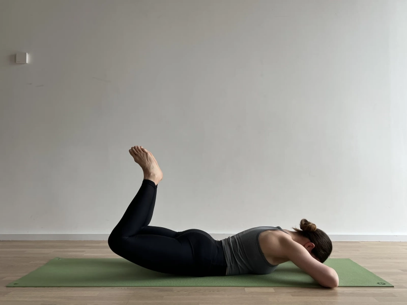 5.Шалабхасана (поза Саранчи, вариация с согнутыми коленями). Ложитесь на живот и обопритесь ладонями о пол. Приподнимая корпус, достаньте нижние ребра и удлините линию живота. Руки положите перед собой ладонями вниз друг на друга. Лоб положите на ладони. Согните колени и соедините стопы друг с другом. Поднимите колени над полом и, оставляя стопы вместе, разведите колени в разные стороны. Можно выполнять в динамике, то есть: на вдохе развести колени, а на выдохе соединять их. А можно просто оставить в фиксации на 5 дыхательных циклов.
