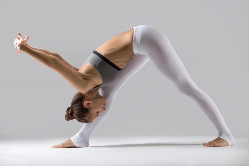 3. Паршвоттанасана (поза интенсивного вытяжения боков, версия с замком рук). Из положения ног на ширине таза, сделайте правой ногой шаг назад, примерно на расстоянии 2-х больших шага. Стопу правой ноги разверните на 45 градусов. Корпус четко смотрит вперёд. Уведите руки за спину и переплетите пальцы. На вдохе оттяните руки вниз, раскрывая грудную клетку вперёд и вверх. На выдохе сделайте наклон к левой ноге. Поднимите руки вверх и заводите назад по мере своей возможности. Расслабьте шею. Следите за положение таза — он закрыт. Колени прямые. Усиление делайте на выдохе, а на вдохе больше вытягиваете линию живота вдоль впереди стоящей ноги. Минимум 5 дыхательных циклов, а затем поменяйте ноги.