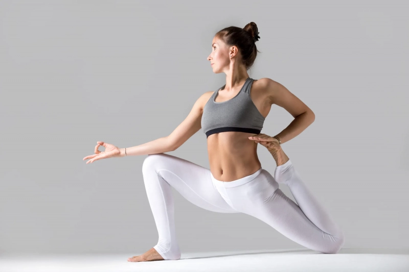 4. Вамадевасана (поза мудреца Вамадевы). Сделайте большой шаг назад. Например, правой ногой и аккуратно опустите правое колено на пол, а левое согните. Проверьте, что у впереди стоящей ноги колено находится над пяткой. Толкните таз вперед и вниз, тем самым растягивая переднюю поверхность бедра. В теории можно начать с этого. Или поднимите правую стопу вверх и с помощью правой руки направьте пятку к ягодице. Таз закрывайте. Если опорное колено чувствует дискомфорт из-за твердой поверхности, то положите плед или полотенце ровно под колено. Фиксируем позу на 5-7 дыхательных циклов, а затем меняем ногу.