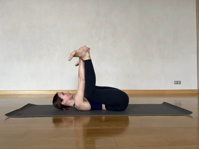 3.Ананда Баласана (поза счастливого ребенка). Ложимся на спину и поднимаем ноги. Сгибаем колени и направляем их к подмышечным впадинам. Ладонями перехватываем пятки с внутренней стороны и нажимаем на свои стопы. Пальцы ног направляем в сторону коврика. Поясницу делаем плоской, максимально прижимаем к полу. Если этого не происходит, чуть напрягаем мышцы живота и подкручиваем таз. Голова остается на коврике. Фиксируем положение на 5-10 дыхательных циклов.
