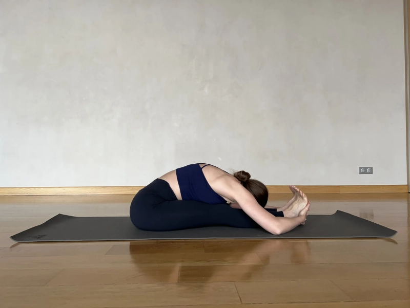 4.Пашчимоттанасана (поза вытяжения задней части тела). Садимся на ягодицы и немного сгибаем колени. Начнем изначально с самой легкой версии. Положите живот на бедра, если не опускается, согните больше колени. Пальцы ног направлены вверх. И на выдохе максимально вытягиваемся вдоль ног. Приоритет — соединение живота и бедер, особенно при «сложных» поясницах! Локти при возможности сгибаем и разводим в стороны и вниз. Заднюю поверхность шеи вытягиваем в одну линию с позвоночником. Усилие делаем на выдохе и, если позволяет задняя поверхность ног, колени вытягиваем. Удлиняем переднюю часть тела (живот и грудной отдел) и соединяем максимально с ногами. Делаем минимум 10 дыхательных циклов.