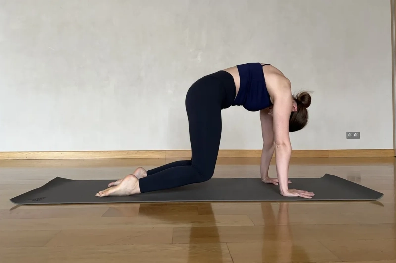 1. Марджариасана (силовая версия позы кошки). Исходное положение как в позе стола: запястья под плечами и на ширине плеч, а колени под тазобедренными суставами на ширине таза. Округлите спину и взгляд направьте в сторону живота. Стопы лежат на полу на внешней поверхности. Ладони полностью раскрыты и плотно прижаты. В этом положении поднимите колени над полом примерно на 7-10 см или на высоту пяток. Напрягите ягодичные мышцы. Удерживаем позу минимум 8 дыхательных циклов.
