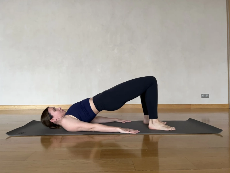 2.Сету Бандха Сарвангасана (поза полумоста, динамическая версия). Ложимся на спину. Колени согнуты, стопы на ширине таза и параллельны друг другу. Руки вдоль тела ладонями вниз. Напрягите ягодичные мышцы так, чтобы вы почувствовали, как ваша поясница становится более плоской. Аккуратно поднимаем таз, медленно позвонок за позвонком. До середины спины в легком варианте и до лопаток в более усложненном. И так же, позвонок за позвонком, аккуратно опускаем таз на коврик, прокатывая строго поочередно каждый позвонок. Больше растягивая спину, чем накачивая ягодицы. Задача: прочувствовать поясничную линию позвоночника и научиться, напрягая мышцы живота, опускать таз, строго прокатывая спину. Повторяем от 8-12 раз.