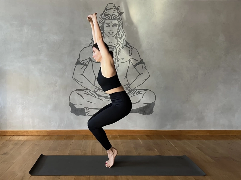 2. Уткатасана (поза Стула, вариация). Из вертикального положения стоя поставьте стопы строго вместе. Сгибая колени, отводим таз назад так, как будто хотим сесть на стул. Следим за тем, чтобы колени не выходили за проекцию пальцев ног. Подкручиваем таз, делая поясницу максимально плоской. Нижние ребра уводим внутрь. Подтягиваем мышцы малого таза (на йоговский терминологии это называется «корневой замок»). Скрестив пальцы рук и вывернув замок из пальцев рук наружу, поднимаем их на одну линию с ушами, головой. Если это положение рук не удается, то можно просто развести ладони на ширину плеч большими пальцами назад (то есть, ладонь смотрит на ладонь). Локти в обоих случаях обязательно прямые. Важно следить за тем, чтобы руки были продолжением диагонали спины. Или еще можно определить правильность выполнения тем, что вы боковым зрением не видите свои руки. Лопатки вниз и удлиняем шею. Как только укрепились в положении, поднимите пятки вверх, переводя себя на пальцы ног. Колени строго вместе. Фиксируем себя на 5 дыхательных циклов, или 20-30 секунд.