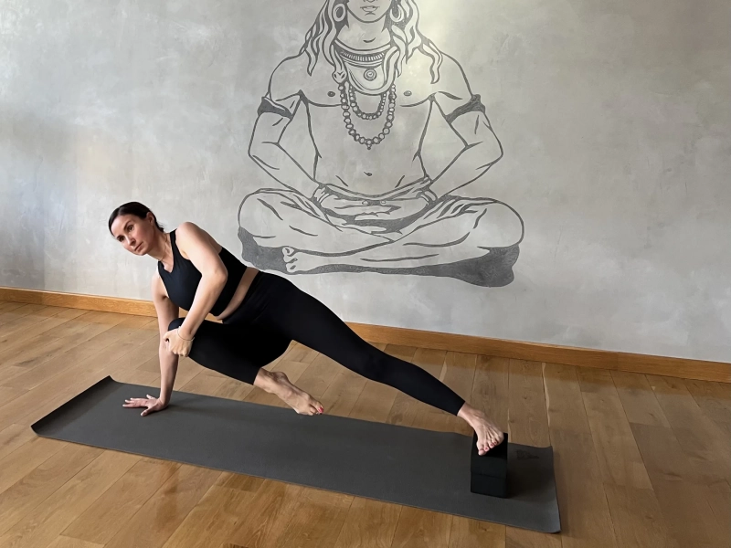 4.Васиштхасана (боковая планка, вариация, или копенгагенская планка). Найдите опору для стопы (в данном случае два йога-блока). Можно использовать диван или стул, но убедитесь в устойчивости опоры. Опираясь на одну руку и одноименное колено, поставьте противоположную стопу на опору. Сосредоточившись поднимите ту ногу, которая без опоры и оказалась ближе к ковру. Можно подхватить колено поднятой ноги противоположной рукой или оставить на весу. Если запястье тяжело выдерживает нагрузку, то перейдите на предплечье. Зафиксируйте это положение 10 секунд, а потом поменяйте сторону.