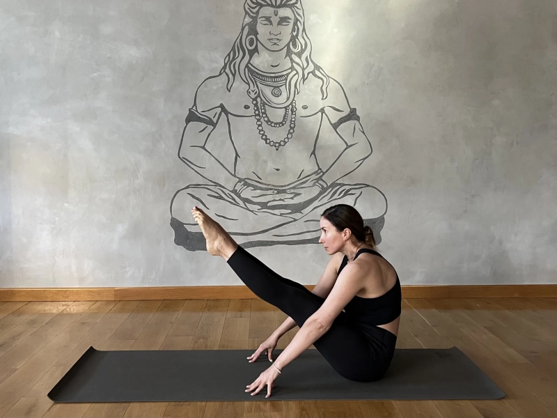 3.Навасана (поза Лодки, вариация). Сядьте на ягодицы, ноги вместе и пальцы ног оттянуты в длину от себя. Колени максимально выпрямлены. Пальцы рук поставьте напротив колен с двух сторон на коврик. И, толкаясь пальцами рук, поднимите ноги вверх. Если сложно поднять сразу 2 ноги, начните с одной. Зафиксируйте это положение на 10 секунд. В последующем увеличивайте время или количество подходов.