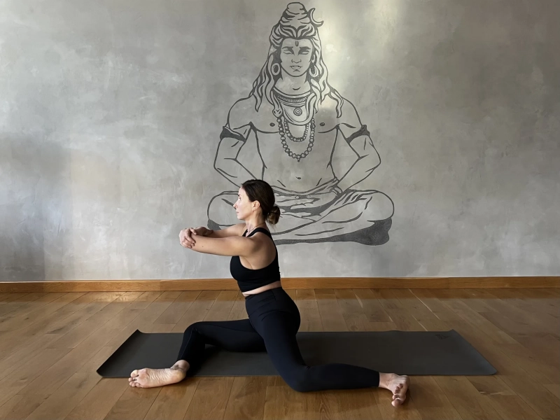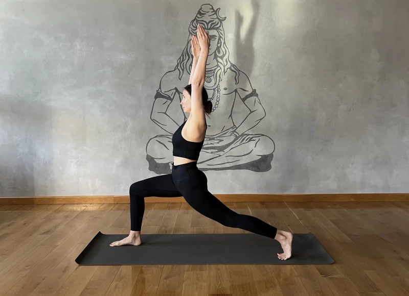 1. Вирабхадрасана 1 (универсальная версия. Поза Воина 1). Из положения стоя сделайте большой шаг назад, допустим левой ногой. На такую длину, чтобы колено впереди стоящей ноги оказалось над пяткой, а коленный сустав согнулся в 90 градусов. Вытяните позади стоящую левую ногу, подтянув коленную чашечку вверх. Левая нога стоит на пальцах, и пяткой тянемся назад и вверх. Корпус и руки вертикально вверх. Ладони разверните друг на друга на ширине плеч. Плечи опущены, взгляд по линии горизонта. Нижние ребра уводим внутрь. Таз закрываем и немного подкручиваем, уводя лобковую кость вверх. Фиксируем положение минимум на 5 дыхательных циклов, а лучше на 10. Повторяем с другой ноги.