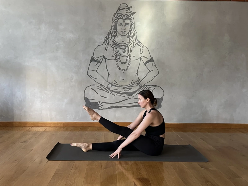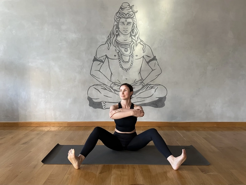 5.Свастикхасана (вариация ног в динамике). Сядьте на ягодицы и разведите ноги на 90 градусов. Согните колени и сократите стопы на себя. Угол коленного сустава тоже постарайтесь удерживать в 90 градусах. С прямой спиной начните вращение в тазобедренных суставах в одну и другую сторону, не меняя градуса колен. Не допускайте неприятного ощущения в коленях, но если получается, то постарайтесь выкладывать ноги по разным сторонам до конца на пол. Вдох — колени вверх, выдох — вращение и т. д. Повторите 10 раз и после задержитесь на каждой из сторон на 10 секунд.