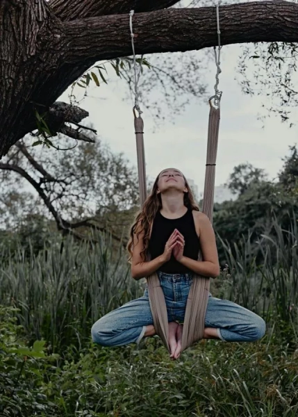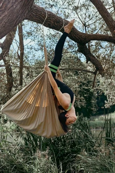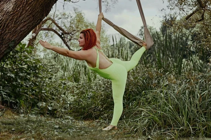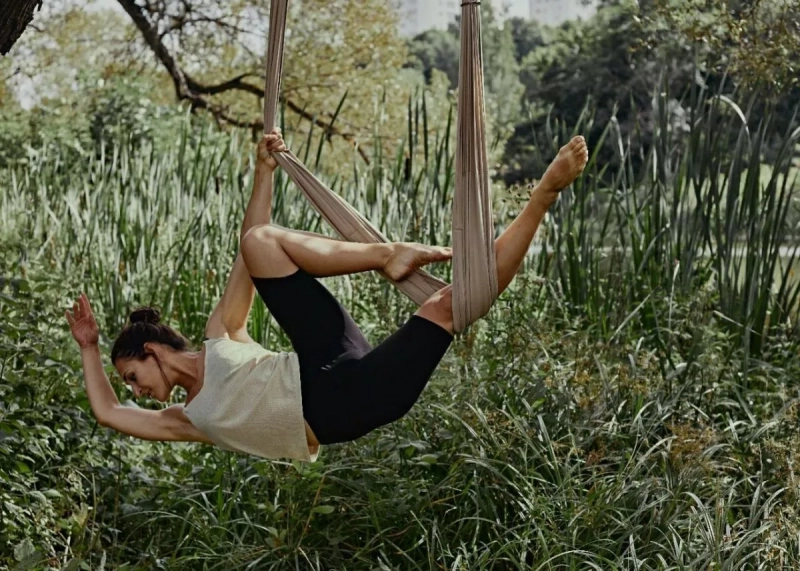 Йога в воздухе – это необычная тренировка с использованием гамака. Главной составляющей практики являются перевернутые позы в комплексе с декомпрессионным переворотом. Она улучшает кровообращение мозга, способствует укреплению отдельных частей тела, увеличивает концентрацию внимания, наполняет тело силой и энергией. Данное направление уже давно развивается за рубежом и в России. Тем не менее, занятия в гамаках не теряют своей актуальности и уникальности, а наоборот, находят всё новые возможности для реализации. Про новый формат тренировок, модные тенденции в мире и… фотоискусства рассказывает Елена Довженко, инструктор по направлению йога в воздухе. Я веду данную практику достаточно долго, где-то 5-6 лет. Всегда стремлюсь к разнообразию, добавляю новые упражнения или полностью меняю структуру тренировки. Ведь мир спорта, йоги, любой активности не стоит не месте. Так, например, я стала использовать гамак для танца! И не только я, конечно. Ведь йога в воздухе – это очень красивая практика, похожая на полет птицы. Чуть позже в голове родилась новая идея: почему бы не вынести гамак на природу?! ФОТО-ТРЕНИРОВКА