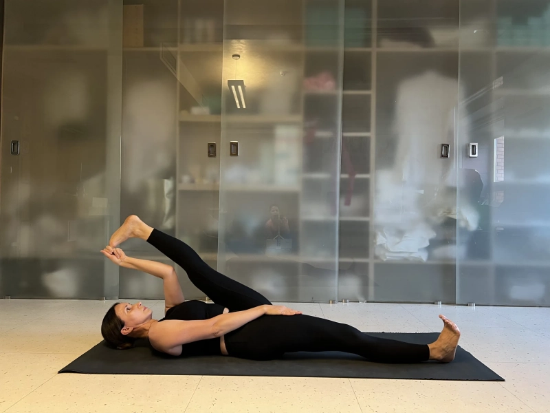 4. Супта Падангуштхасана (Обхват большого пальца ноги в положении лежа). Лягте на спину и согните одну ногу, например правую. Поставьте стопу правой ноги на пол, а левую обхватите за большой палец ноги левой рукой. Если сложно дотянуться, то возьмите йога-ремень или что-то похожее, например, ремешок от домашнего халата или шарф. И начинаем тянуть ногу на себя на выдохе. Следим за тем, чтобы затылок лежал на полу и шея не напрягалась. В том случае, когда вам становится уже легко, вытяните ту ногу, которая стоит на полу, в данном случае правую. Фиксируем на 5-10 дыхательных циклов и потом меняем ногу.