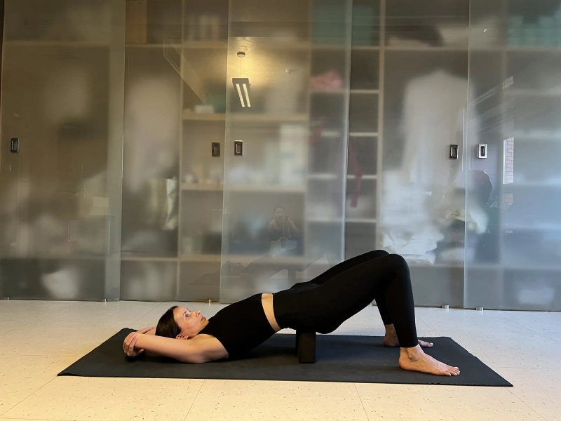 3. Сету Бандхасана (поза Полумоста, вариация с кирпичом). Ложимся на спину. Колени согнуты, стопы на ширине таза и параллельны друг другу. Руки вдоль тела ладонями вниз. Поднимите таз вверх отталкиваясь ногами от пола. Если подвижность плеч позволяет, то переплетите пальцы рук, активнее собирая плечи. Или выполните как на фото, подложив под крестец блок для йоги или туго скрученное одеяло. Следите за коленями, не позволяйте им располагаться шире, чем ваш таз. Грудной клеткой накатываемся на грудной отдел, больше прогибаясь именно в грудном, чем в поясничном отделе позвоночника. Фиксируем себя на 5 дыхательных циклов, затем медленно опускаем таз вниз.