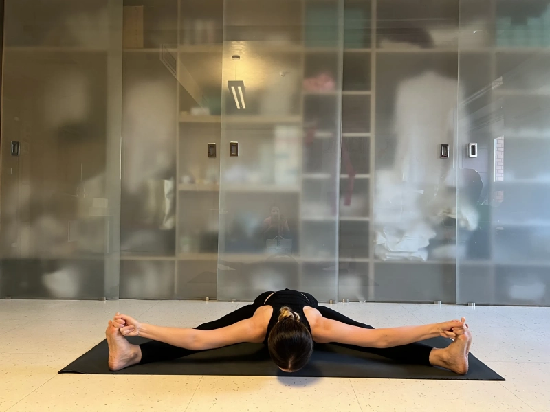 1. Упавиштха Конасана (поза угла сидя). Сядьте на ягодицы и разведите ноги широко. Пальцы ног направьте вверх. Если сложно сидеть с прямыми ногами в этой позе и спина всё время заваливается назад и округляется, то согните ноги и, пятками опираясь в пол, направьте согнутые колени вверх. Главное не терять соединяющую линию от поднятых пальцев верх с коленями и тазобедренными суставами. Все на одной линии, стопы и колени не заваливаются. И аккуратно на выдохе начинаем наклонять корпус вперёд. Спина по возможности прямая. Перехватите йоговским хватом (указательные и средний палец кольцом соединяется с большим пальцем руки) большие пальцы ног. Если растяжка позволяет, то можно опуститься максимально вниз. Держим эту асану минимум 10 дыхательных циклов.
