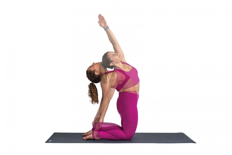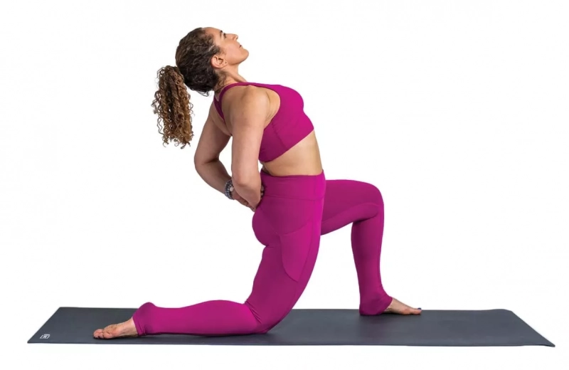 Из позы Стола сделайте шаг левой ногой вперед. Поднимите туловище. Переплетите пальцы рук за спиной, затем положите их на крестец, чтобы удлинить поясницу. Вдохните и поднимите грудь. На выдохе выгните спину. Задержитесь здесь на 3-5 вдохов-выдохов. Повторите с другой стороны.
