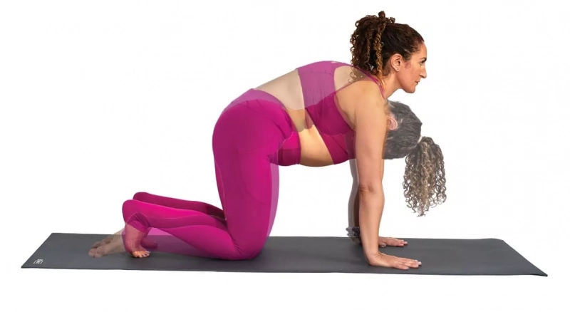 Встаньте на четвереньки. Запястья под плечевыми суставами, колени под тазобедренными. Взгляд направьте в пол. На вдохе прогнитесь в спине. Раскрывайте грудную клетку, подбородком тянитесь вперёд. Лопатки сведите вместе, плечи отведите от ушей. Войдите в Битиласану. На выдохе округлите спину. Макушкой тянитесь к полу, но подбородок не прижимайте к груди. Отталкивайтесь руками от пола, чтобы больше потянуться вверх грудным отделом, войдите в Марджариасану. Повторите упражнение 3 раза.