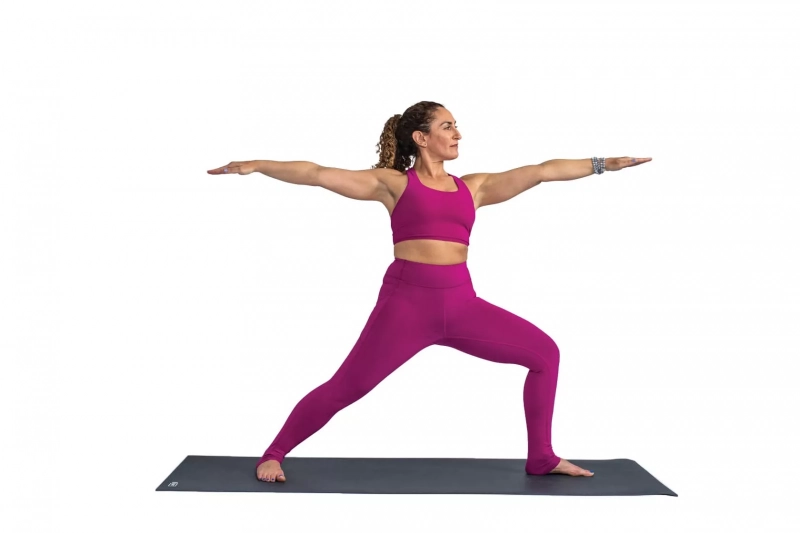 Из позы Воина II переверните ладонь передней руки вверх. Откиньте туловище назад и другую руку опустите к нижней части живота. Затем на выдохе наклонитесь вперед и поменяйте руки. Повторите упражнение 3 раза. Затем вернитесь к позе Воина II.