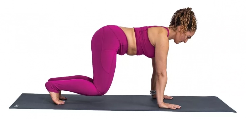 Вернитесь на четвереньки. Соберитесь с духом, вдохните и упритесь руками в коврик. Выдохните и поднимите колени на несколько сантиметров от пола. Задержитесь, зависнув в позе на 3-5 вдохов-выдохов. Верните колени на пол.