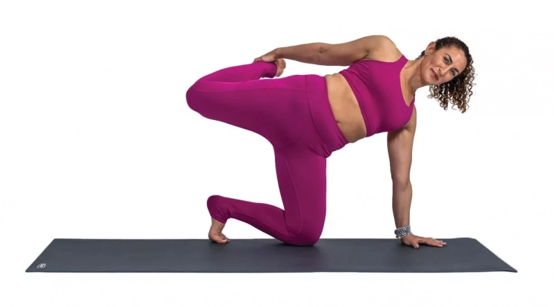Обхватите левую ногу руками в Анджанеасане. Перенесите вес тела на левую ладонь. Поверните тело вправо. Поднимите правую ногу на высоту бедра. Согните правое колено и обхватите ступню правой рукой. Задержитесь в асане на 5 вдохов-выдохов. Вернитесь на четвереньки. Повторите с другой стороны.