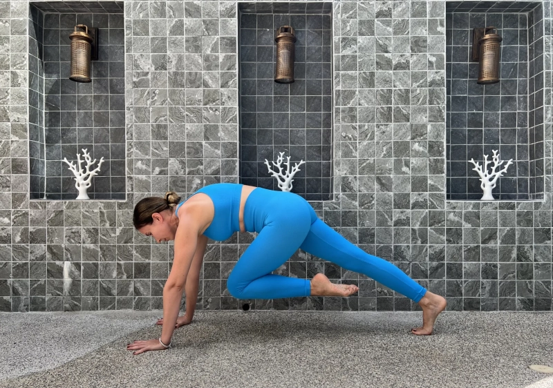 1. Вирабхадрасана 1 (поза Воина 1, вариация). Из положения стоя сделайте большой шаг назад, допустим левой ногой. На такое расстояние, чтобы колено впереди стоящей ноги оказалось над пяткой, а коленный сустав согнулся в 90 градусов. Вытяните позади стоящую левую ногу, подтянув коленную чашечку вверх. Корпус уведите в диагональный наклон относительно пола (то есть 45 градусов). Живот и нижние ребра уведите внутрь. Руки продолжают диагональ корпуса и тянутся вперед. Зафиксируйте себя в этом положении минимум на 10 дыхательных циклов, или 20-30 секунд и поменяйте ноги.