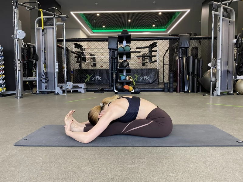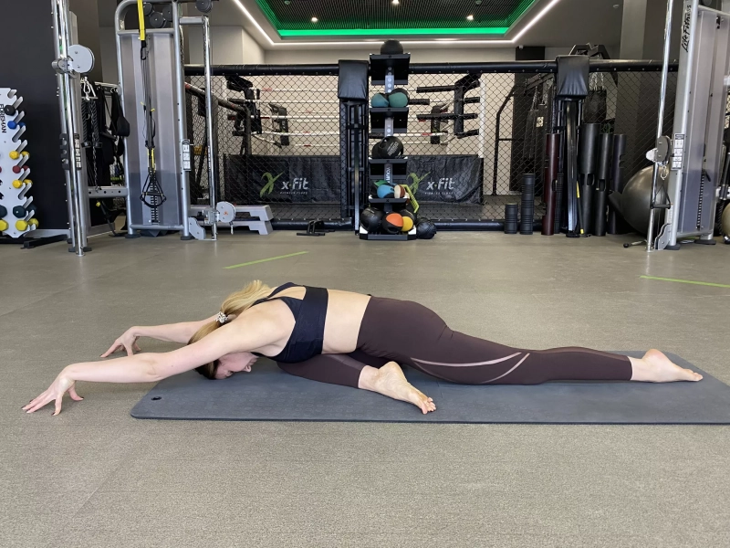 Садимся на ягодицы и немного сгибаем колени. Начнем изначально с самой легкой версии. Положите живот на бедра, если не опускается, согните больше колени. Пальцы ног направлены вверх. И на выдох максимально вытягиваемся вдоль ног. Приоритет — соединение живота и бедер, особенно при «сложных» поясницах! Локти при возможности сгибаем и разводим в стороны и вниз. Заднюю поверхность шеи вытягиваем в одну линию с позвоночником. Усилие делаем на выдох, и если позволяет задняя поверхность ног, колени вытягиваем. Удлиняем переднюю часть тела (живот и грудной отдел) и соединяем максимально с ногами. Минимум 10 дыхательных циклов.