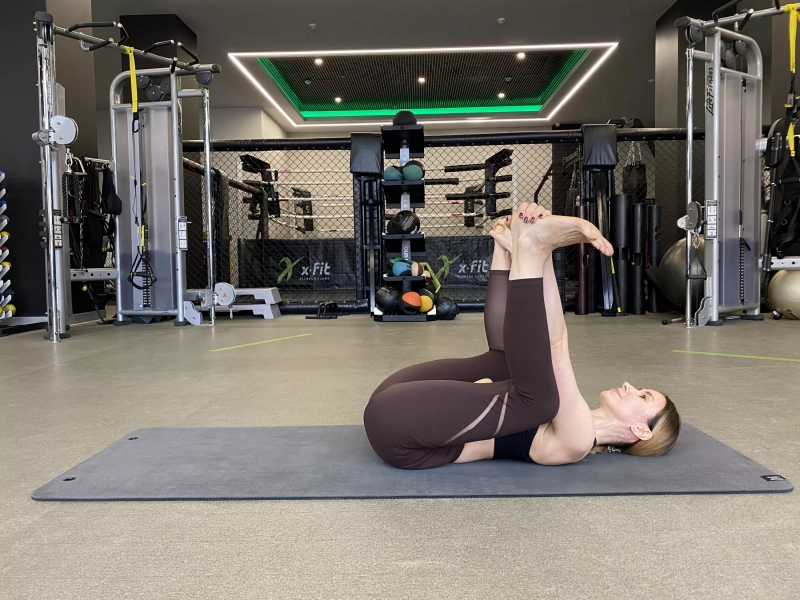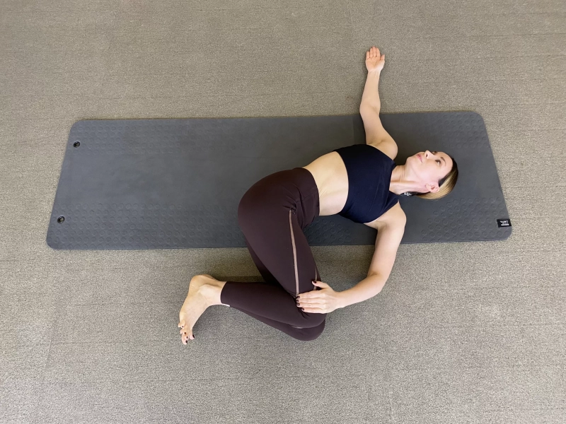 Поясницу делаем плоской, максимально прижимаем к полу. Если этого не происходит, чуть напрягаем мышцы живота и подкручиваем таз. Голова остаётся на коврике. Фиксируем положение на 5-10 дыхательных циклов.