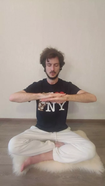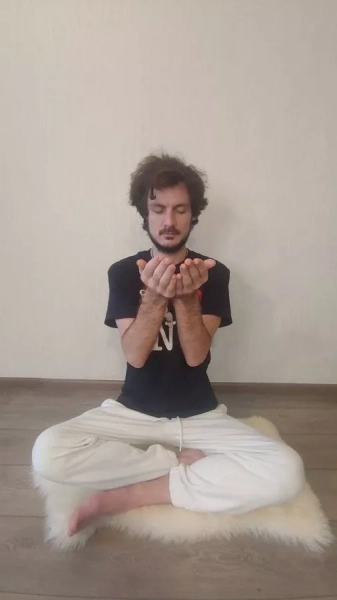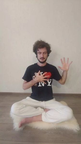 Мудра: широко разведите пальцы на каждой руке, займите максимальную площадь. Так вы активируете все элементы. Правая рука давит на сердечный центр, левая посылает энергию во всю Вселенную. Ощутите, что вы едины со всем.